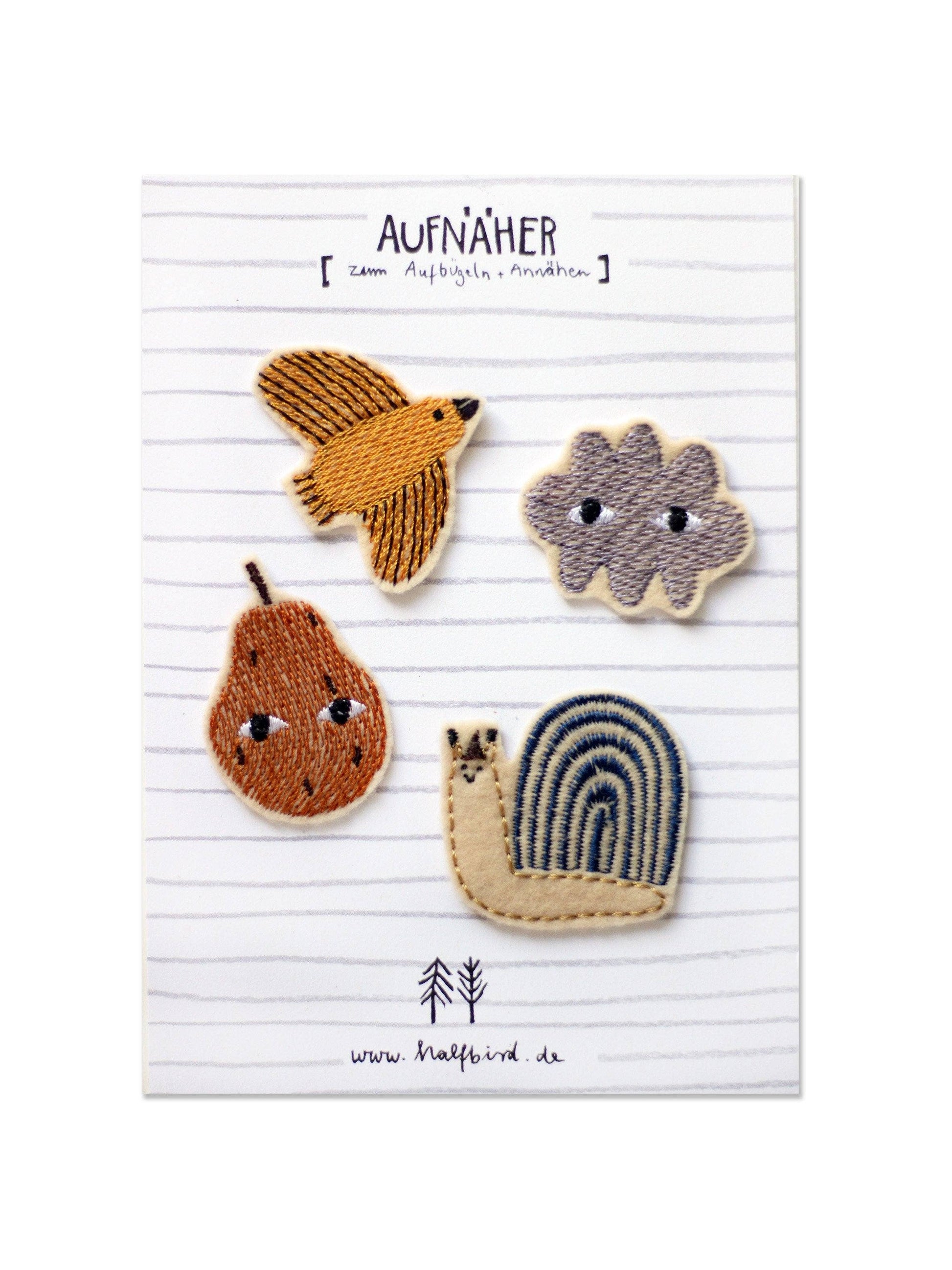 Aufnäher SET "Schnecke, Birne, Wolke, Vogel"