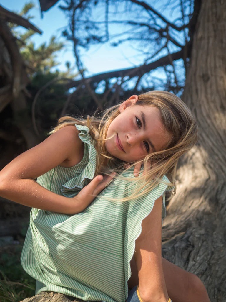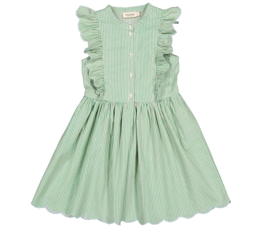 Kurzes Kleid mit kurzen Ärmeln, Rüschen-Details und Knopfverschluss vorne. Das Kleid hat Volumen und feine Wellenmuster am Saum. Die Länge reicht bis oberhalb des Knies.