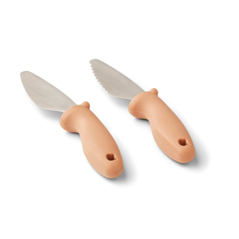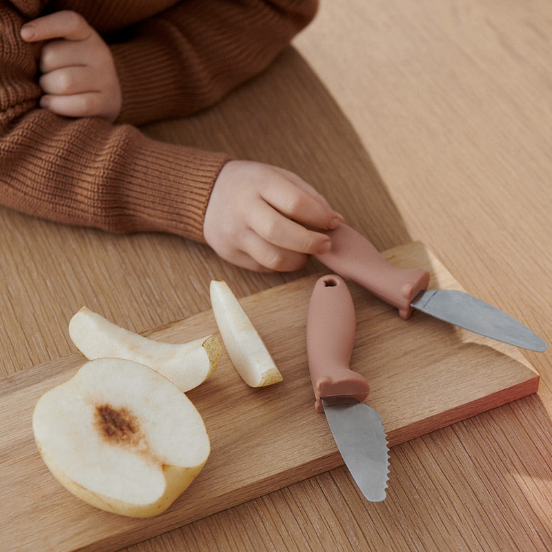 Kinderfreundliche Messer von Liewood. Die Messer eignen sich perfekt, um die Kinder ans Schneiden heranzuführen. So können sie in der Küche mithelfen, ohne sich dabei zu verletzen. Die offizielle Altersempfehlung ist 3+, wir benötigen sie jedoch schon früher, insbesondere für weiche Sachen wie Bananen. Eigenschaften: Spülmaschinenfest
