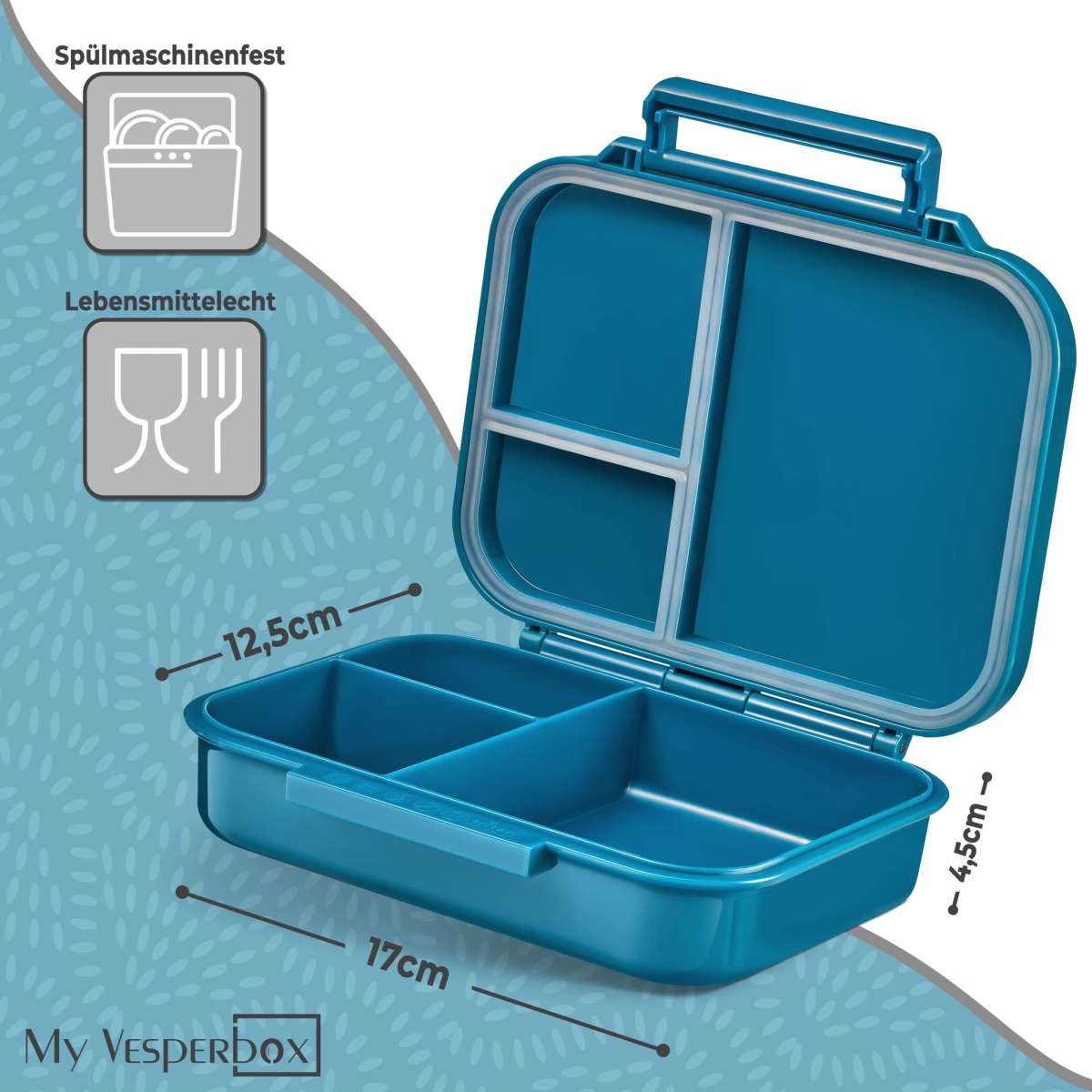 Die auslaufsichere Bento-Lunchbox mit 4 Unterteilungen. Das Produkt ist selbstverständlich nachweisbar frei von sämtlichen Schadstoffen wie BPA und Weichmachern. Die Znünibox ist ebenso unkompliziert von Hand als auch problemlos in der Spülmaschine zu reinigen, (oberes Fach der Spülmaschine wird empfohlen.) m Deckel der Bento Box befinden sich Dichtungen, diese verhindern ein Vermischen sowie das Auslaufen von feuchten Lebensmitteln. (Achtung - gilt nicht für Flüssigkeiten.)