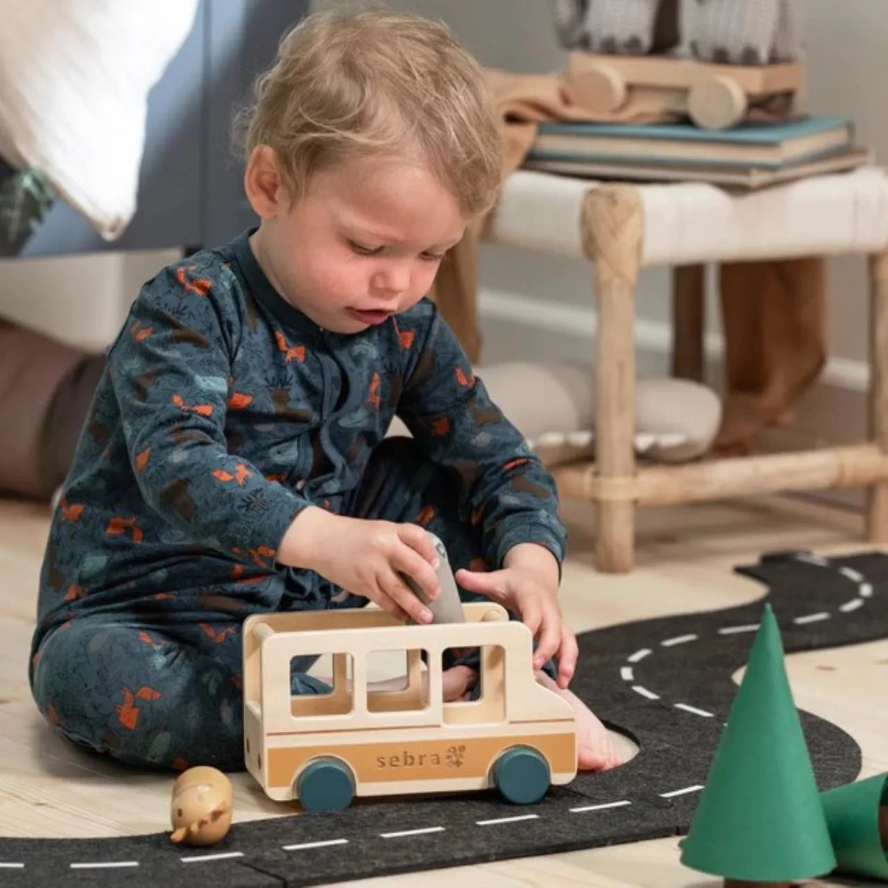 Der Bus und die drei Fahrgäste sind aus Holz gefertigt und in gedeckten Farben bemalt. Die Giraffe, der Tukan sowie das Faultier aus der Wildlife-Serie sitzen lose und können leicht verschoben werden, wodurch Ihr Kind seine feinmotorischen Fähigkeiten trainiert, indem es die Figur im Bus platziert und wieder entfernt. Als zusätzliches Detail verfügt die Giraffe über Ohren und der Tukan über steife Filzfedern am Kopf. Die drei Figuren passen auch in das Spielflugzeug von Sebra.