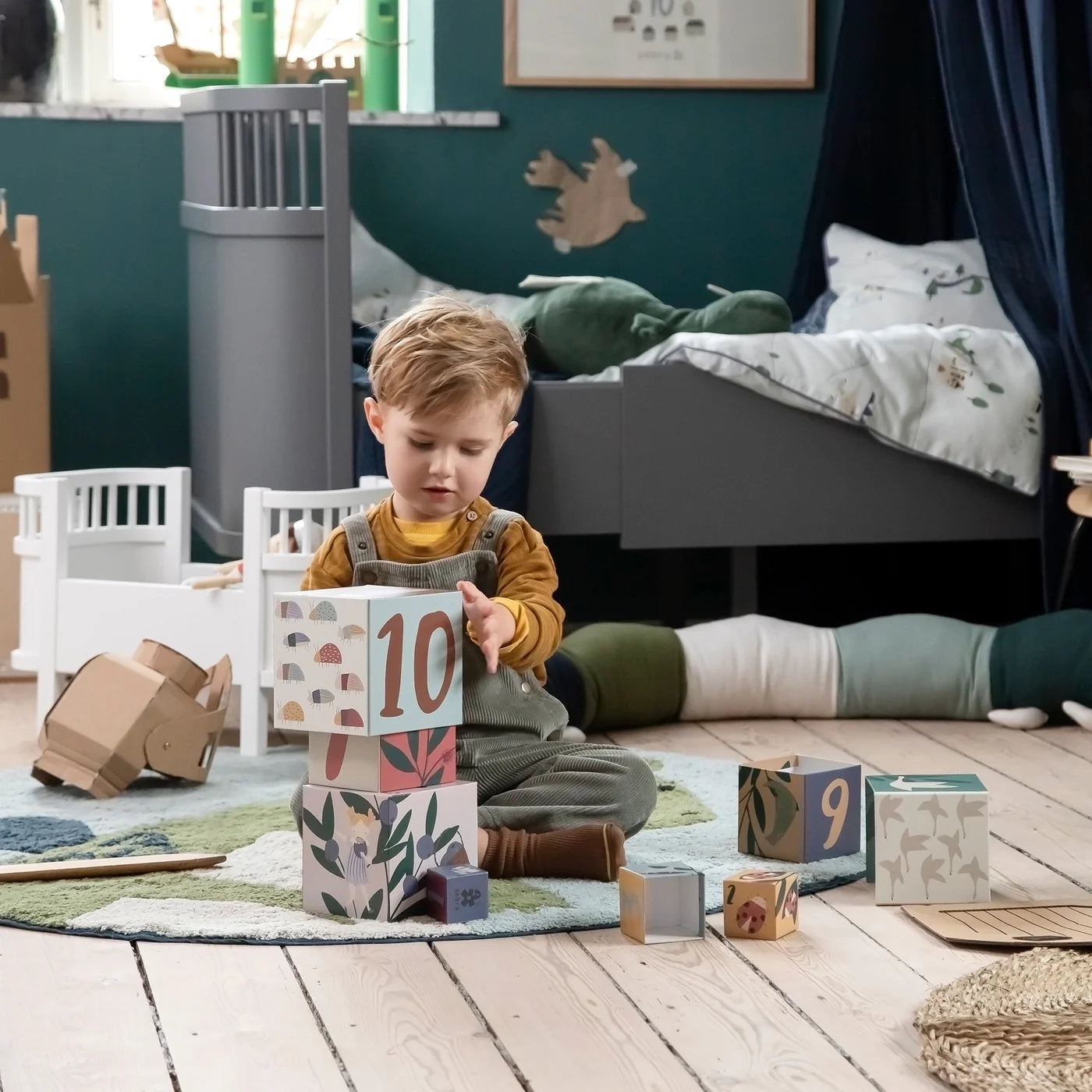 Für die etwas grösseren Kinder sind die Zahlen von 1 bis 10 auf den Stapelblöcken interessant. Diese können als Hilfsmittel verwendet werden, um die Zahlen und Begriffe wie „kleiner“ und „grösser“ zu lernen. Der grösste Block verfügt nämlich über die Zahl „10“ und der kleinste über die Zahl „1“. Darüber hinaus gibt es Illustrationen zu entdecken: Der Block mit der Zahl 9 zeigt z. B. neun Blaubeeren, während der Block mit der Zahl 3 Abbildungen von drei Pferden zeigt usw. Auf diese Weise kann das Kind sowohl ein Gefühl für Mengen als auch für das visuelle Erscheinungsbild der Zahlen bekommen.