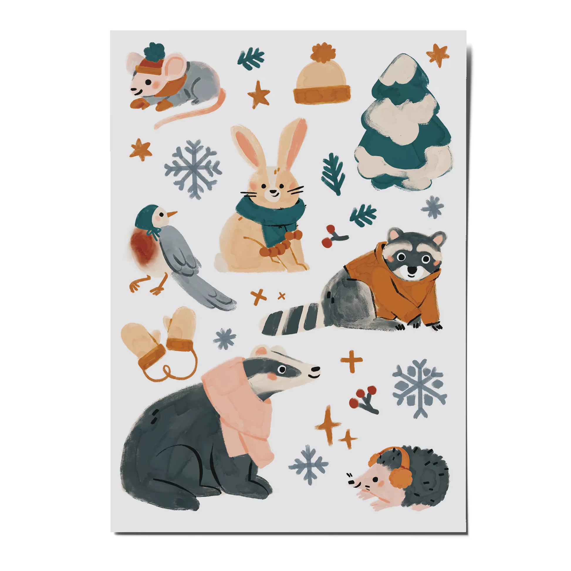 Klebetattoos mit Hase, Dachs und Waschbär. Auf diesem Kindertattoo-Bogen findet ihr süsse Tiere mit winterlichen Outfits.