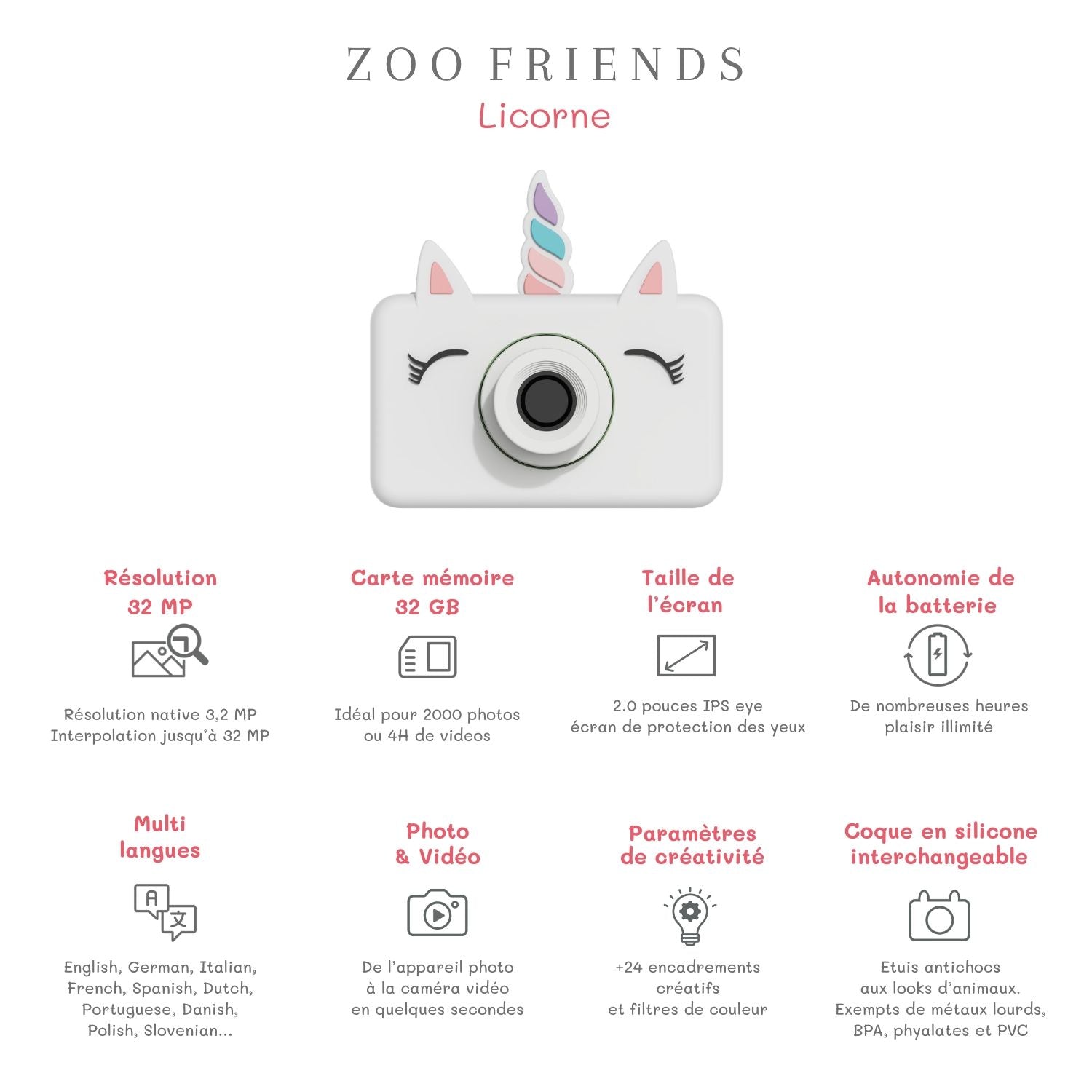 Die Zoofamily Einhorn-Kinderkamera begeistert mit einer 24-Megapixel-Digitalkamera und einem Videorekorder, ideal für Kinder ab 3 bis 10 Jahren. Dank niedlichem, kompaktem Design ist sie leicht und einfach zu bedienen. Mehr als 20 digitale Filter & Rahmen sowie kreative Aufkleber sorgen für zusätzlichen Spaß.